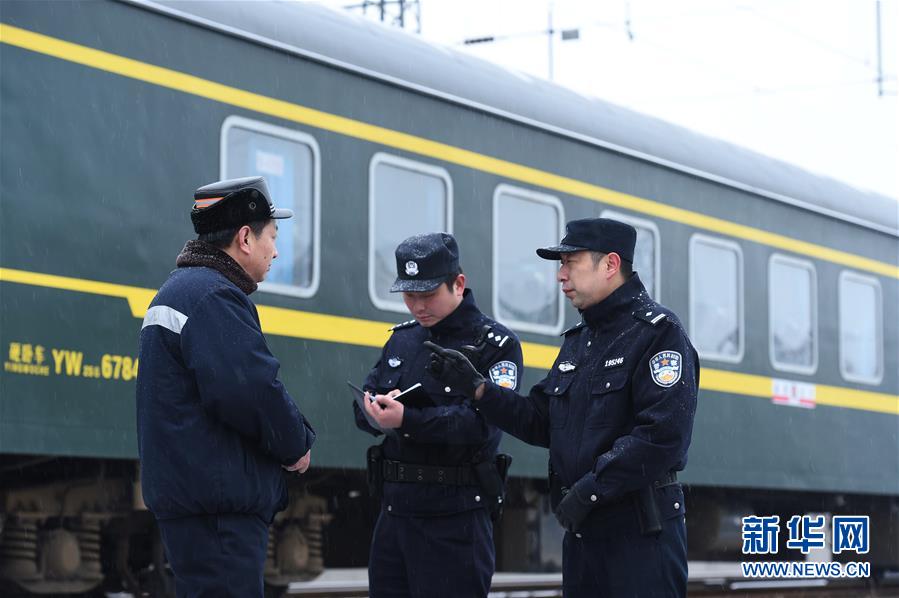 2月8日,武汉铁路公安局襄阳公安处民警向铁路职工了解增开旅客列车看护情况。 新华社发(施勇 摄)