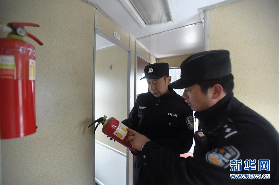 2月8日,武汉铁路公安局襄阳公安处民警对增开旅客列车消防器材进行巡查。 新华社发(施勇 摄)