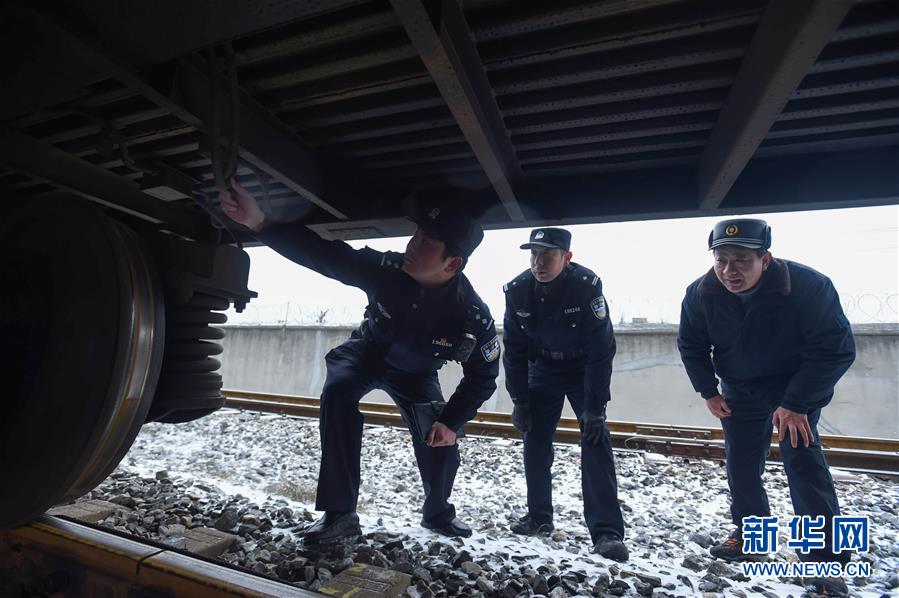 2月8日,武汉铁路公安局襄阳公安处民警与铁路职工对增开旅客列车进行巡查。 新华社发(施勇 摄)