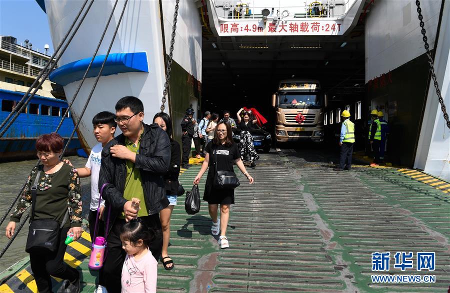 2月9日,停靠在广东湛江海安港的紫荆二十二号客滚船上,旅客有序下船。 新华社记者 杨冠宇 摄
