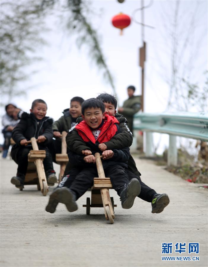 2月9日,孩子们在柳寨村北西苗寨参加传统木板车体验活动。 当日是大年初五,贵州省黔东南苗族侗族自治州剑河县南寨镇柳寨村北西苗寨的苗族群众欢聚一堂,在蒙眼摸鸭、传统木板车体验、犁田捉鱼、比赛背媳妇等民俗活动中欢度新春佳节。 新华社发(方鹏 摄)