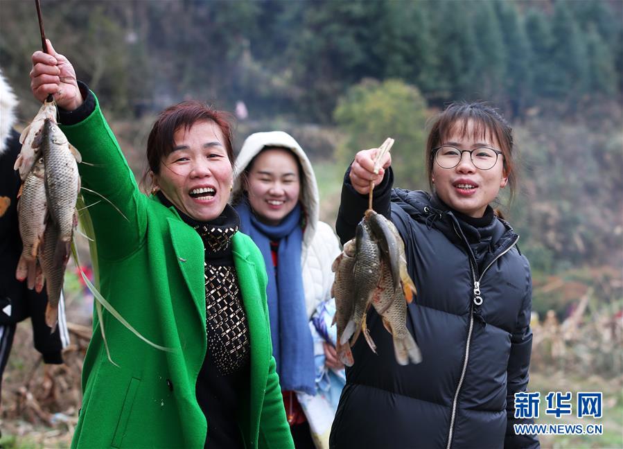 2月9日,在柳寨村北西苗寨,村民在展示在犁田捉鱼活动中抓到的鱼。 当日是大年初五,贵州省黔东南苗族侗族自治州剑河县南寨镇柳寨村北西苗寨的苗族群众欢聚一堂,在蒙眼摸鸭、传统木板车体验、犁田捉鱼、比赛背媳妇等民俗活动中欢度新春佳节。 新华社发(方鹏 摄)