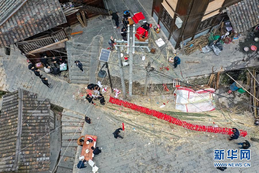 2月9日,稿仰村的民间手工艺人在扎制彩龙(无人机拍摄)。 当日是正月初五,在贵州省黔东南苗族侗族自治州台江县施洞镇稿仰村,民间扎龙手工艺人抓紧制作本村的彩龙。台江县苗族同胞有在春节、元宵节期间“舞龙嘘花”的习俗。 新华社发(欧阳光林 摄)