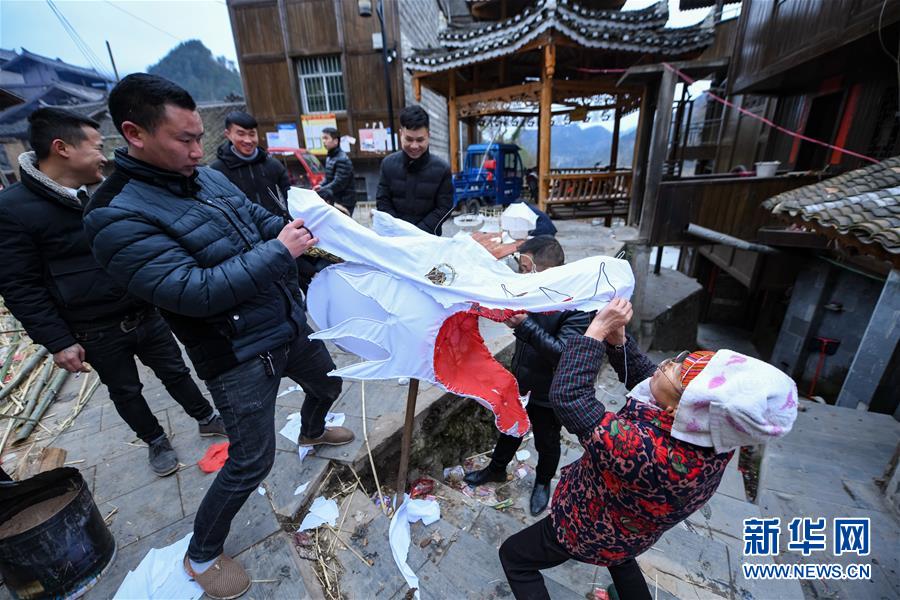 2月9日,稿仰村的民间手工艺人在扎制彩龙。 当日是正月初五,在贵州省黔东南苗族侗族自治州台江县施洞镇稿仰村,民间扎龙手工艺人抓紧制作本村的彩龙。台江县苗族同胞有在春节、元宵节期间“舞龙嘘花”的习俗。 新华社发(欧阳光林 摄)
