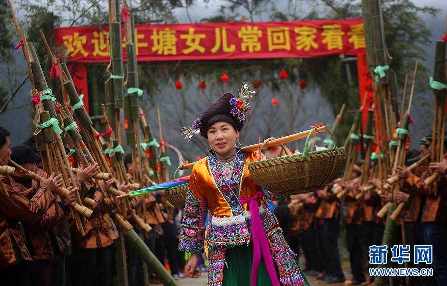 2月9日,在良双村牛塘苗寨,外嫁女贾雪娇挑着礼物回娘家。 当日,广西柳州市融水苗族自治县红水乡牛塘苗寨举行外嫁女集体回娘家活动。300多名外嫁女挑着礼物回到娘家,通过芦笙踩堂、唱苗歌和百家宴等传统民俗活动,与娘家人共诉亲情,同贺新春。 新华社发(龙林智 摄)