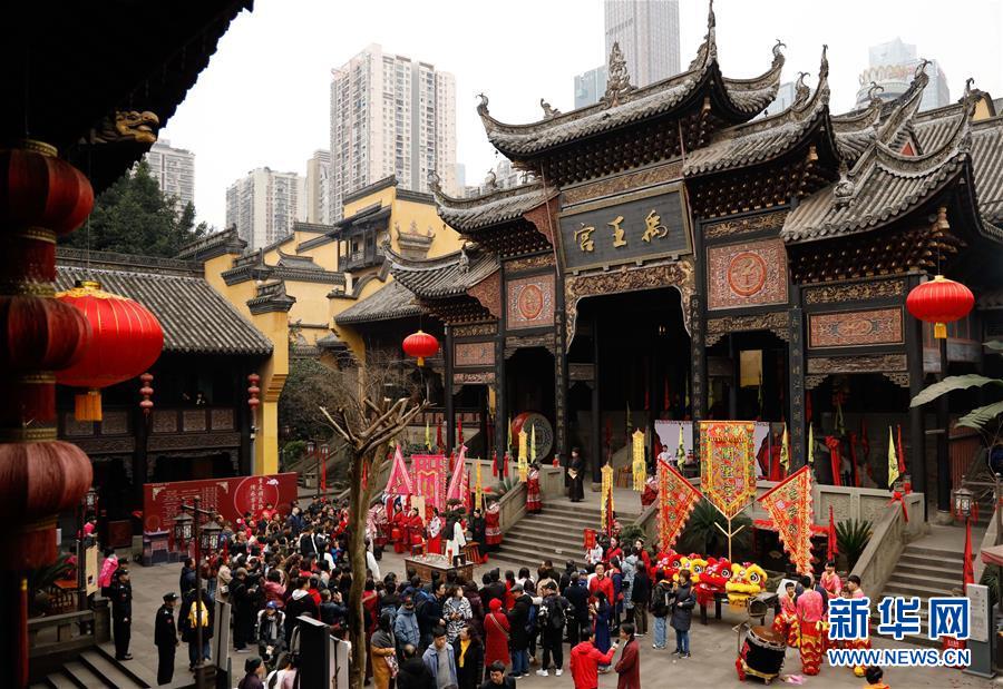 这是2月9日拍摄的重庆湖广会馆内的禹王祭祀典礼活动现场。 当日是农历正月初五,重庆湖广会馆举行禹王祭祀典礼和迎财神巡游,吸引了众多市民和游客。 新华社记者 刘潺 摄