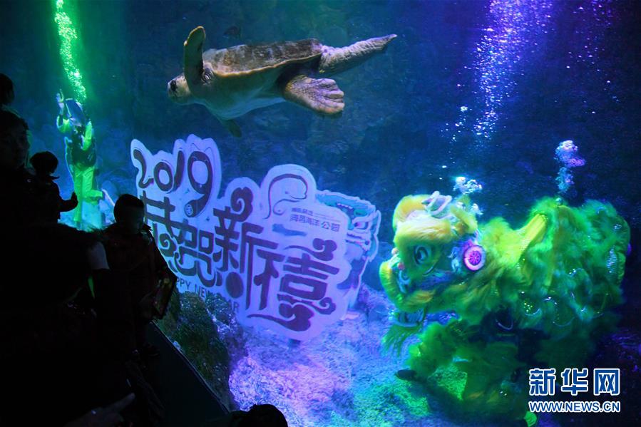 2月9日,潜水员在水下表演舞狮。 春节期间,青岛海昌极地海洋公园推出“水下舞龙舞狮”表演。潜水员背上氧气瓶,换上演出服装,潜入水下为游客带来“漫游龙宫”“神龙摆尾”“龙腾狮跃”等耳目一新的表演。 新华社记者 李紫恒 摄