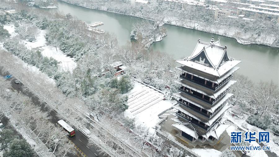 这是2月9日无人机拍摄的合肥市包公园清风阁。 近日,安徽合肥出现降雪天气。雪后,合肥市包公园内景色别致。 新华社记者 张端 摄