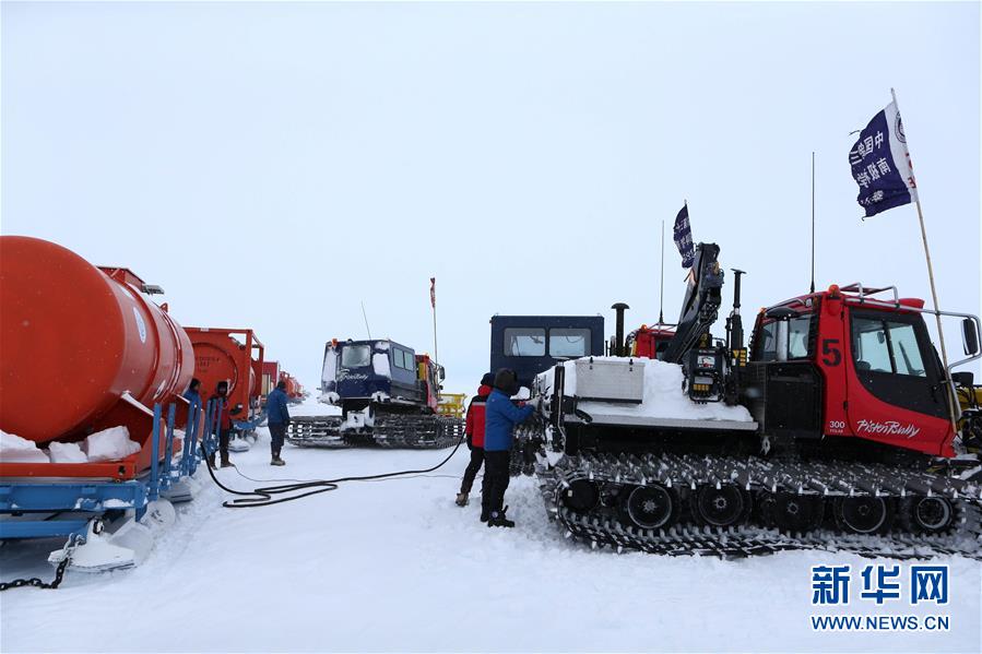 2月8日,南极科考内陆队的车队在途中加油。新华社记者 刘诗平 摄