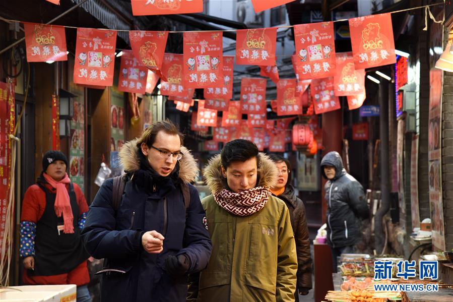 2月9日,游客在劈柴院内参观游览。 春节期间,青岛百年老院劈柴院举行“贺年会”,推出各种地方名、特、优小吃和民俗戏曲演出,吸引市民和游客前往感受传统年味。 新华社记者 李紫恒 摄