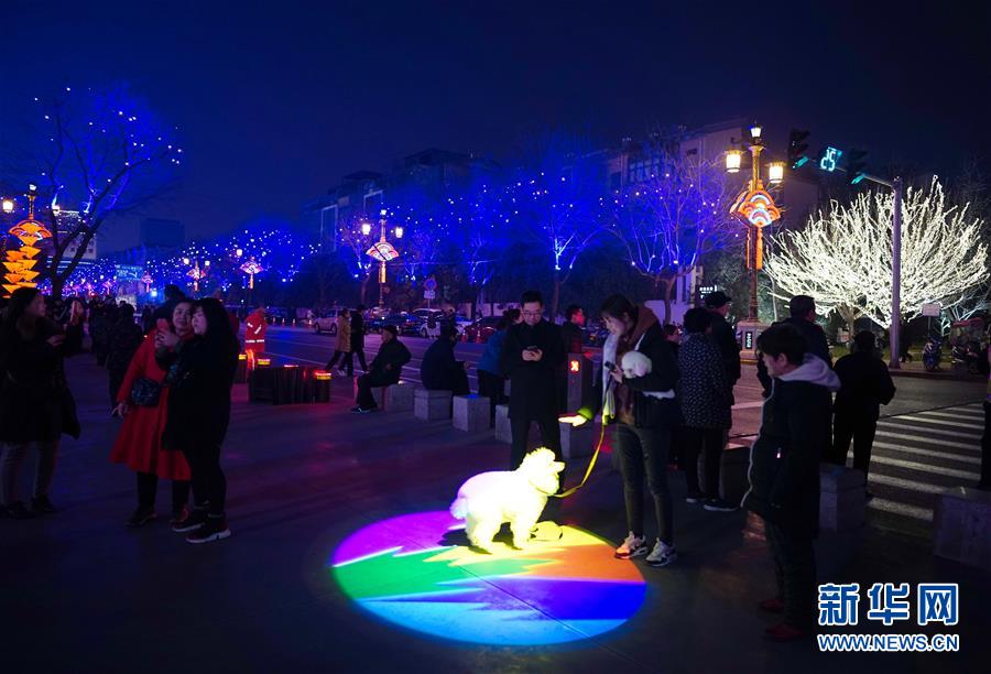 2月5日,游客在西安市曲江新区大唐不夜城开元广场上游玩。 春节期间,古城西安举办丰富多彩的2019“西安年·最中国”系列旅游活动,市内历史文化景区的夜景更令众多游客流连忘返。 新华社记者 邵瑞 摄