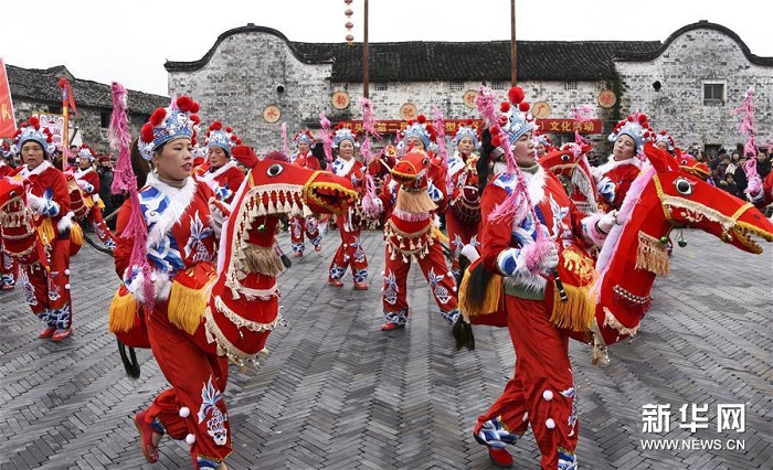 2月10日,在浙江台州市仙居县埠头镇楼下王村,村民表演传统民俗“跳跳马”。 当日是春节长假最后一天,各地举行的假日活动丰富多彩。 新华社发(王华斌 摄)