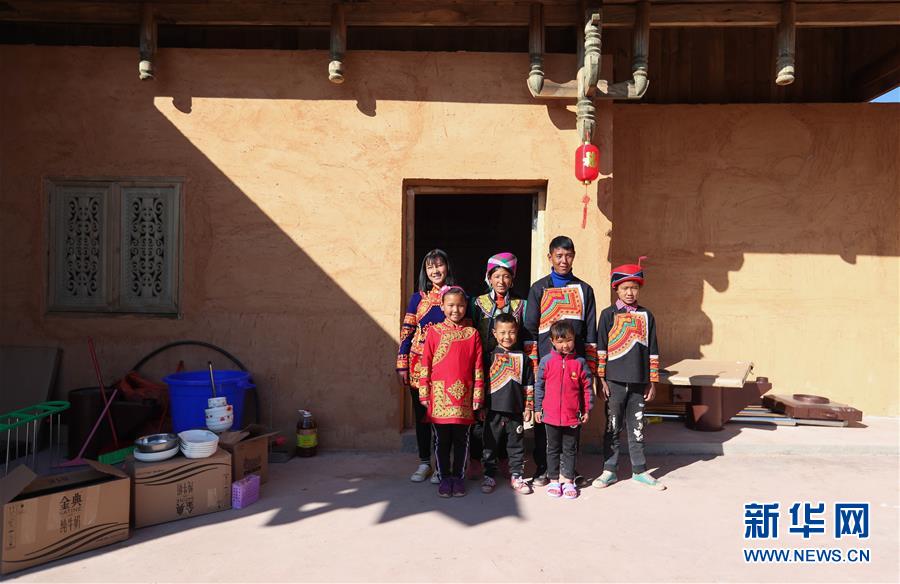 2月11日,昭觉县三河村吉好也求(后排右二)一家人在新居前合影留念。