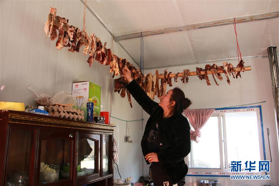 在米林县派镇垄白安置点,直白村村民在活动板房内整理风干肉(1月31日摄)。新华社记者 田金文 摄