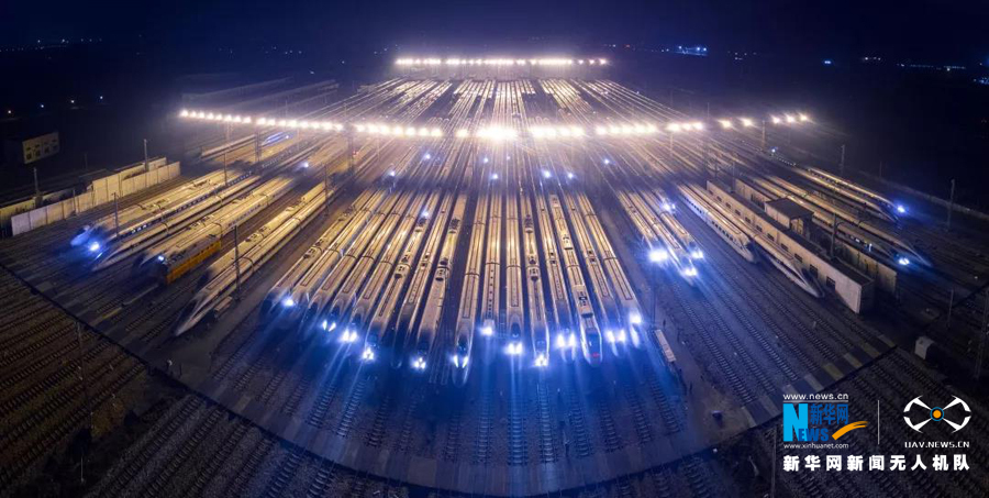 今年春运,每当夜幕降临,百组“复兴号”动车组停靠在广州动车段各运用所上,整装待发,宛如“陆地舰队”。新华网发(宋兴华 摄)