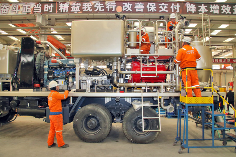 2月11日,在山东烟台一家石油装备技术有限公司,工人在制造固井车。