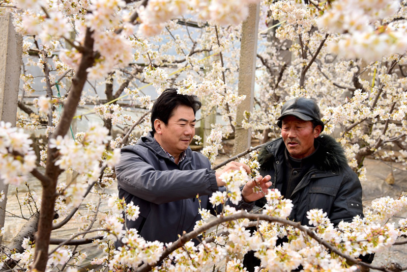 2月11日,山东省枣庄市水泉镇农技干部(左)在赵岭村果树大棚传授樱桃花期管理技术。