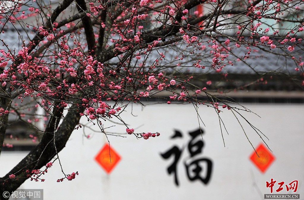 安徽黄山:古梅迎春绽放娇艳欲滴