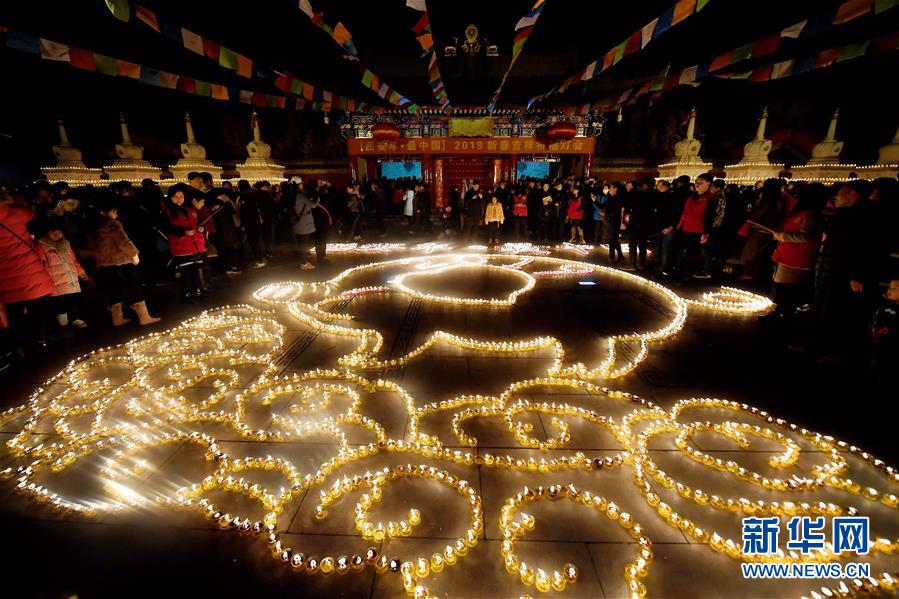 2月12日,民众在西安广仁寺2019新春吉祥祈福灯会上点燃酥油灯。 新华社记者 刘潇摄