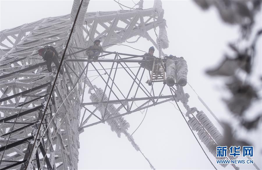 2月12日,国网武汉市黄陂区供电公司工作人员在进行抢修作业(无人机拍摄)。 新华社记者 肖艺九 摄