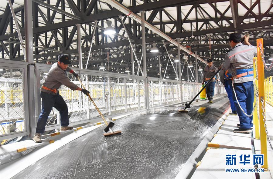 2月12日晚,济南东动车所的车皮清洁工在对一列复兴号进行车皮清洁作业。新华社记者王凯摄