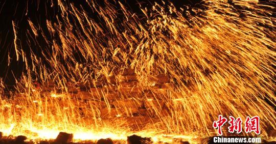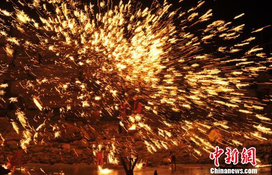 吴桥杂技灯会现场,艺人在表演打铁花。 苑立伟 摄