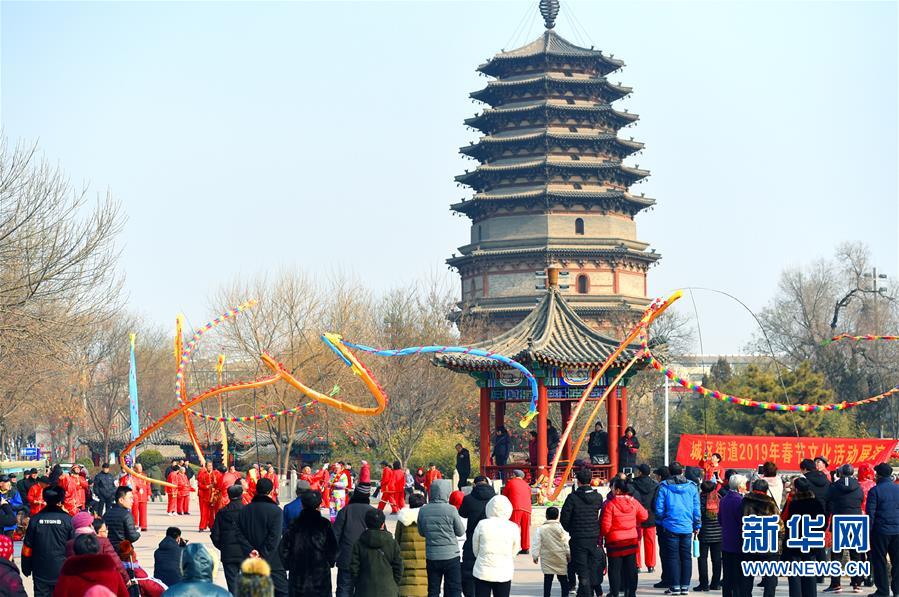 2月11日,游客在石家庄市正定古城观看民俗表演。