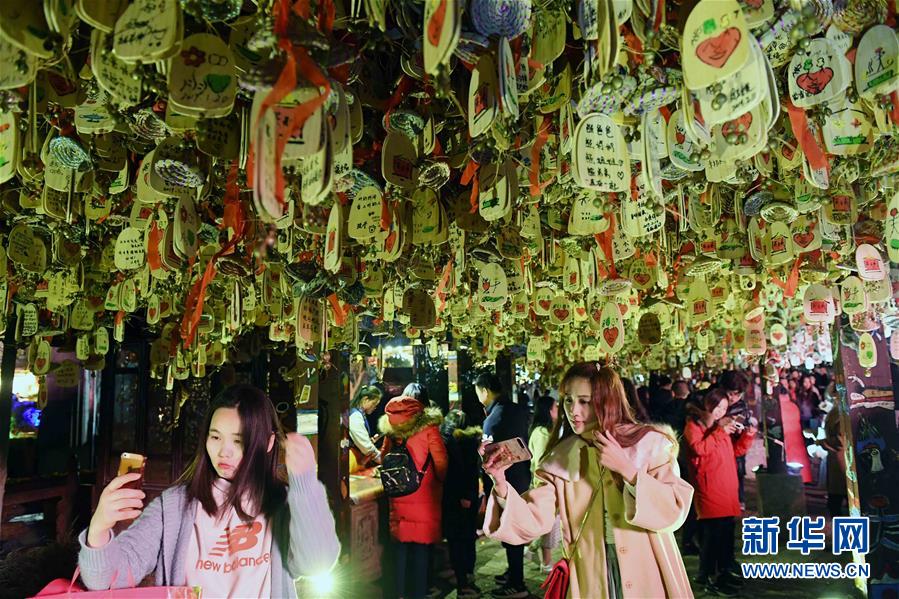 2月12日,游人在丽江古城拍照。夜色中的云南丽江古城,灯光璀璨,景色迷人,游人如织。 新华社记者杨宗友摄
