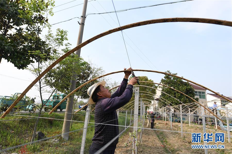 无锡宜兴白塔村村民在搭建葡萄大棚(2018年4月2日摄)。新华社记者 季春鹏 摄
