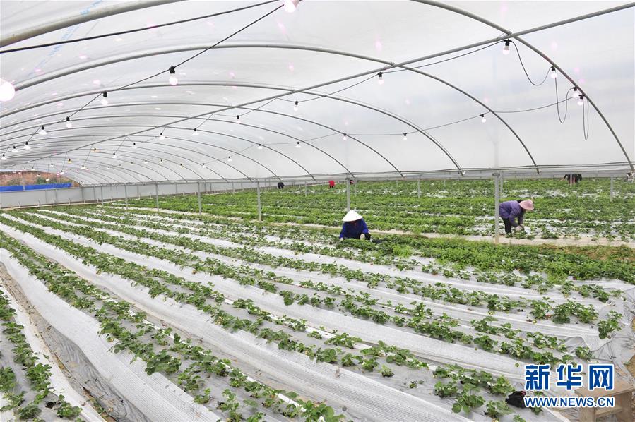 2月13日,农民在广西南宁一家现代农业科技园的草莓大棚里除杂草。 新华社发(喻湘泉 摄)