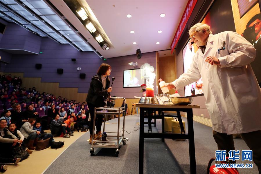 2月13日,来自英国的化学家戴伟教授(右)在活动中演示利用酒精与化学物质配合点燃蜡烛的实验。