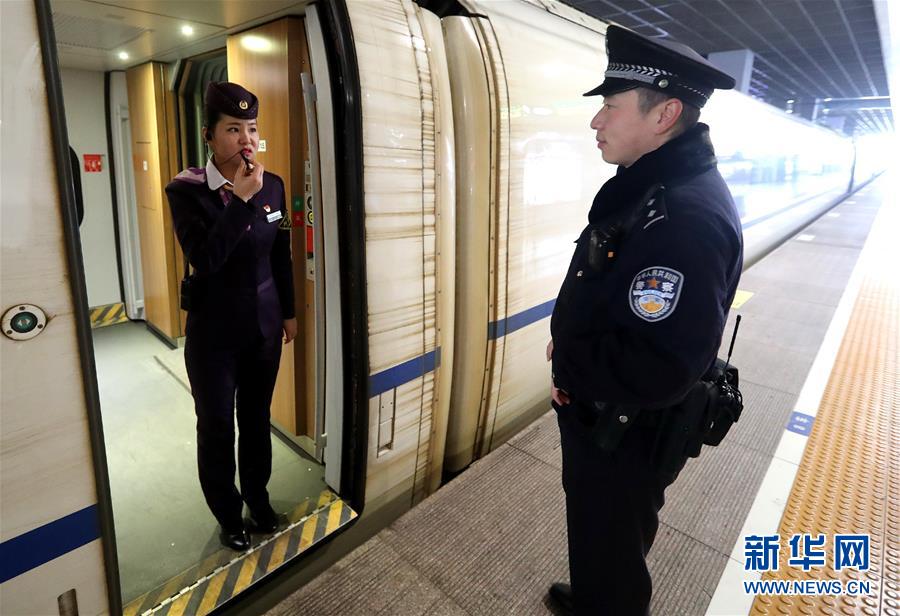 2月13日,值乘G1329次高铁的列车长梅姗姗下达列车关门指令后与丈夫刘璞告别。