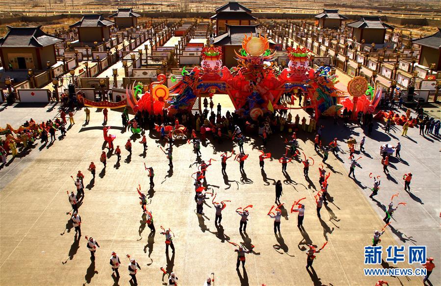 2月12日,在甘肃张掖甘州区碱滩镇古城村,民间艺人在九曲黄河灯阵亮灯前进行社火表演。 新华社发(陈礼 摄)