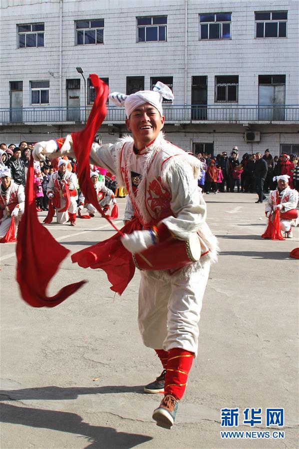 2月12日,山西省吕梁市方山县的民间艺人在表演腰鼓。 新华社发(肖继旺 摄)