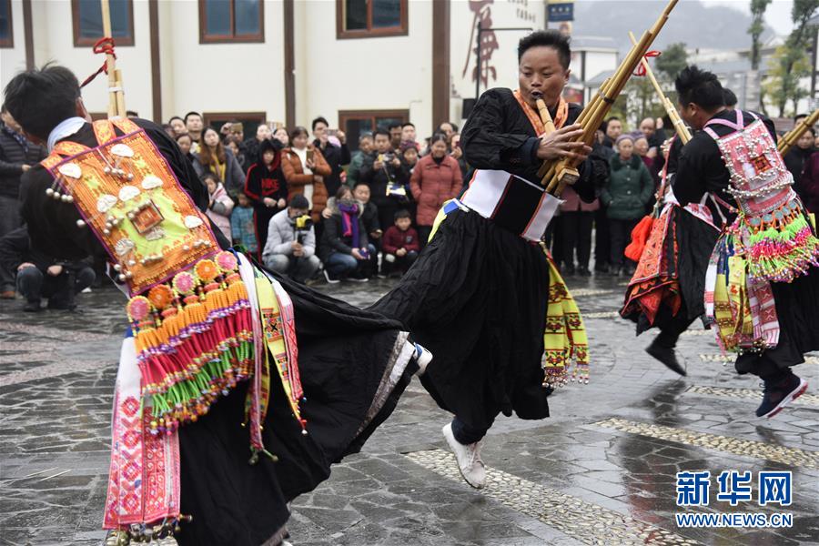 2月13日,在贵州省黔南布依族苗族自治州龙里县龙山镇举行的“民俗迎春展演”现场,村民在表演斗鸡舞。 新华社发(罗显琴 摄)