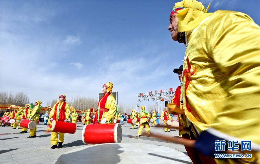 2月13日,甘肃张掖甘州区新墩镇传统社火表演队的演员们在滨河新区水天一色广场进行太平鼓表演。 新华社发(王将 摄)