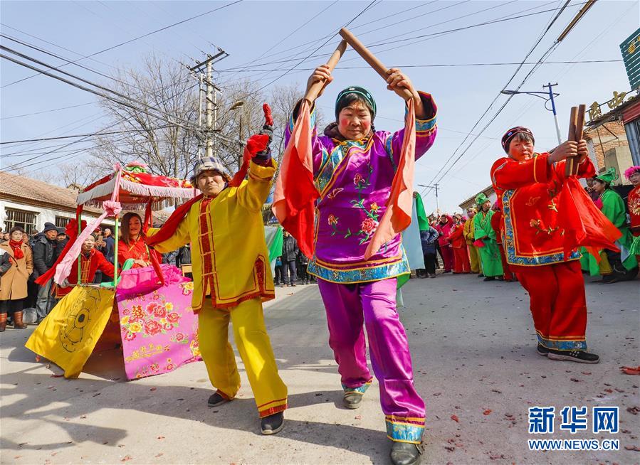 2月13日,河北省唐山市丰润区沙流河镇石佛寺村的民俗表演队在街头进行表演。 新华社发(刘满仓 摄)