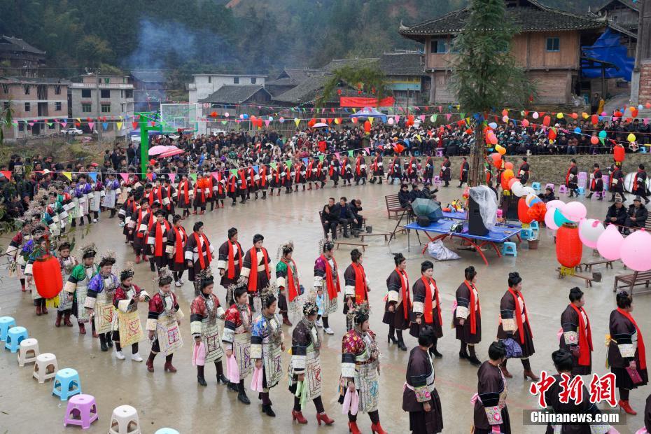 2月13日,贵州榕江平定侗寨,各村寨的侗族民众身着盛装踩歌堂。当日,贵州省黔东南苗族侗族自治州榕江县乐里镇平定侗寨邀请相邻的8个侗寨侗族民众前来寨中“吃相思”,各村寨男女青年聚集一堂“吃相思”,增进友谊。吃相思,俗称“为客”,侗语叫“越嘿”,时间多在农历正月、二月或秋后,是侗族地区村寨之间为拓宽社交,加深友谊而举行的民族风情活动。中新社记者 贺俊怡 摄