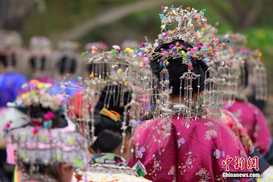 2月13日,贵州榕江平定侗寨,侗家女头戴绚丽的银饰在踩歌堂。当日,贵州省黔东南苗族侗族自治州榕江县乐里镇平定侗寨邀请相邻的8个侗寨侗族民众前来寨中“吃相思”,各村寨男女青年聚集一堂“吃相思”,增进友谊。吃相思,俗称“为客”,侗语叫“越嘿”,时间多在农历正月、二月或秋后,是侗族地区村寨之间为拓宽社交,加深友谊而举行的民族风情活动。中新社记者 贺俊怡 摄