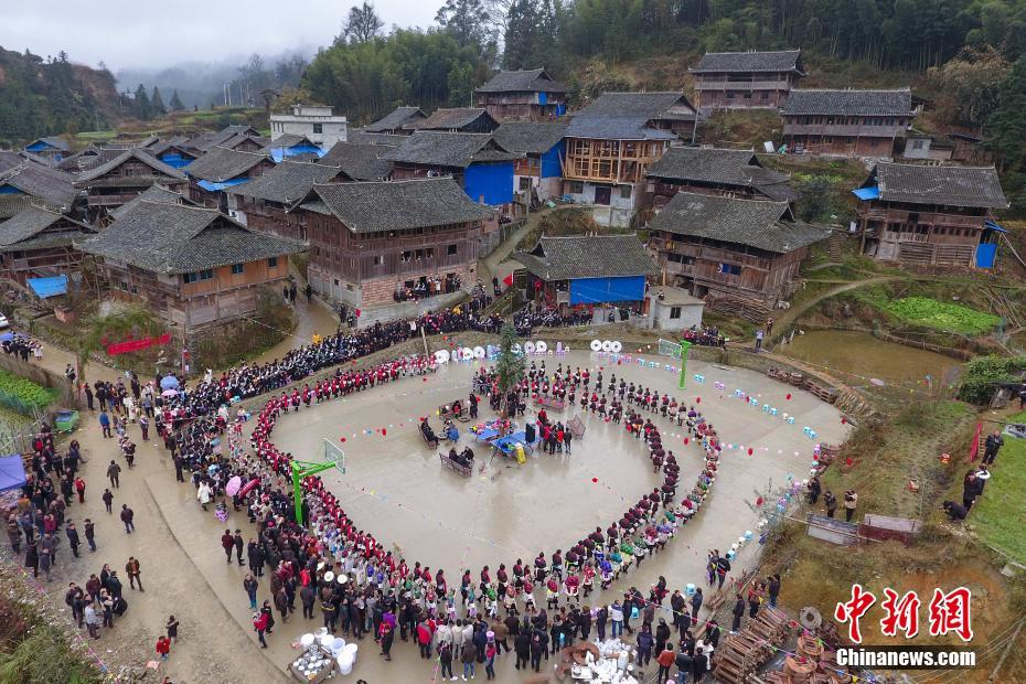 2月13日,贵州榕江平定侗寨,各村寨的侗族民众身着盛装踩歌堂。当日,贵州省黔东南苗族侗族自治州榕江县乐里镇平定侗寨邀请相邻的8个侗寨侗族民众前来寨中“吃相思”,各村寨男女青年聚集一堂“吃相思”,增进友谊。吃相思,俗称“为客”,侗语叫“越嘿”,时间多在农历正月、二月或秋后,是侗族地区村寨之间为拓宽社交,加深友谊而举行的民族风情活动。 中新社记者 贺俊怡 摄