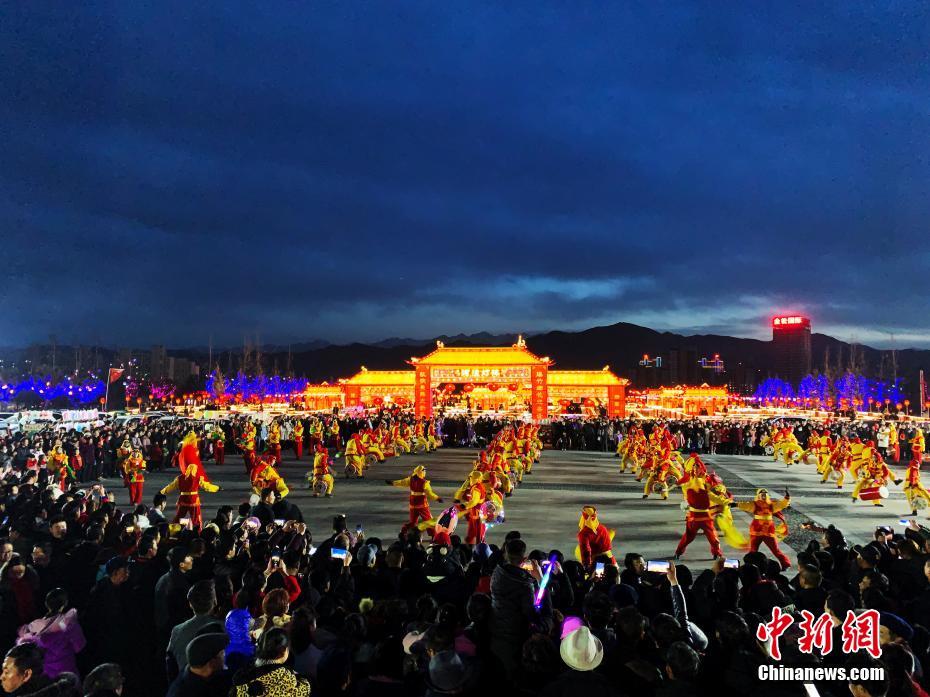 2月13日,农历正月初九,南凉古都青海省海东市乐都区上万民众穿越“九曲黄河灯阵”领略河湟民俗文化魅力。南凉古都九曲黄河灯阵是一个按九宫八卦搭建的灯城,长约4.5公里,中间为紫禁城,其余八城按照八卦方位排列,散布紫禁城周遭。从空中俯瞰,整个灯阵又分成了9个小的灯阵。在青海民间,逛灯阵可以迎春纳福,祈求平安,是当地春节期间必不可少的民俗活动。图为当地民众观看节目。 中新社记者 孙睿 摄