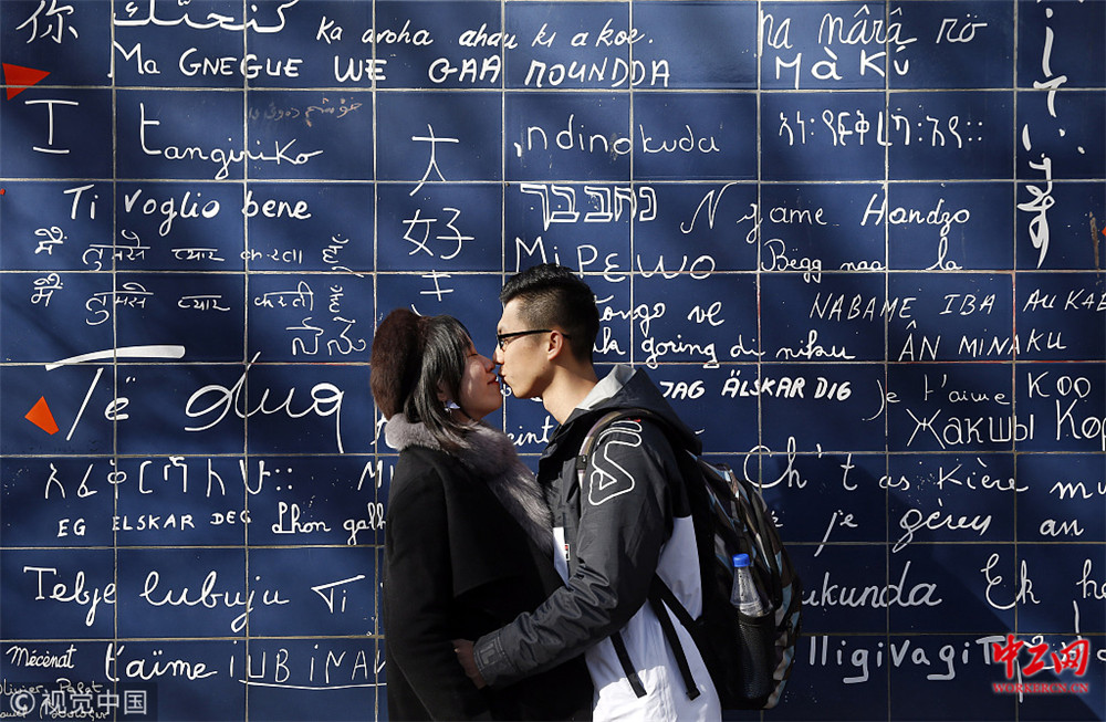 情人节巴黎街头现“爱情墙” 情侣甜蜜亲吻留念