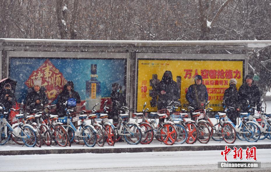 2月14日,河北石家庄迎来降雪,市民在雪中等候公交车。中新社记者 翟羽佳 摄