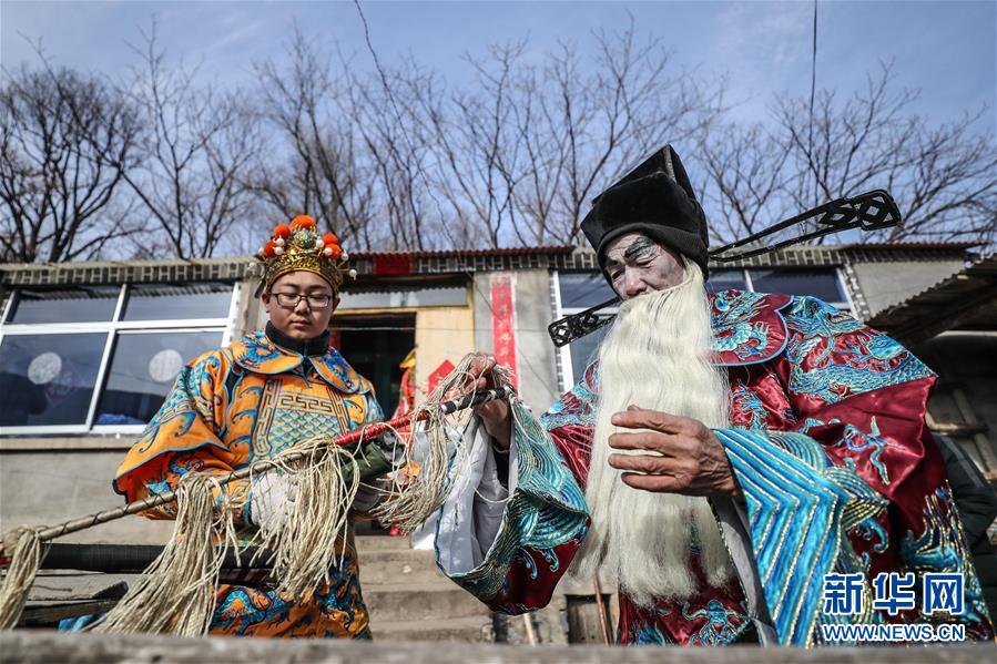 2月12日,辽宁本溪满族自治县同江峪村村民在整理演出使用的道具。新华社记者 潘昱龙 摄
