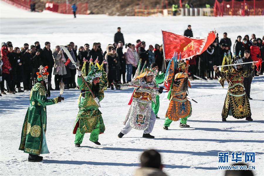 2月13日,辽宁本溪满族自治县同江峪村村民在本溪花溪沐云山滑雪场表演本溪社火。新华社记者 潘昱龙 摄