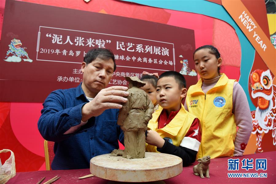 2月14日,“泥人张彩塑工作室”艺人在活动现场制作泥人。