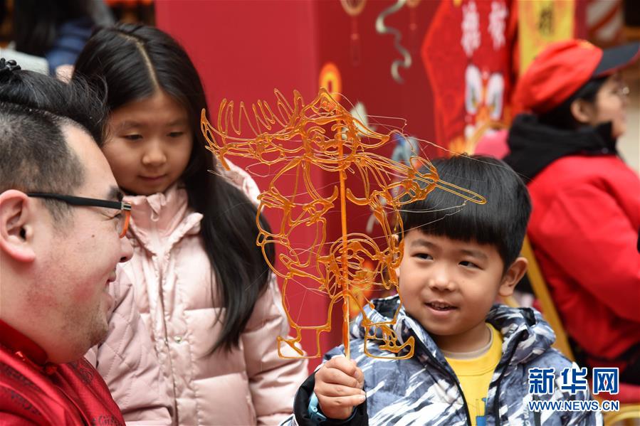 2月14日,一名男孩展示糖画艺人现场创作的“猪八戒”。