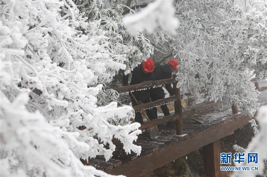 受低温雨雪天气影响,湖南张家界武陵源风景区部分高海拔地区出现持续冰冻现象,当地各部门对游览索道、电梯、观光电车等载人运输工具及高山游步道进行铲雪除冰,并加强对各类旅游设备的检查维护力度,保障旅游接待安全。