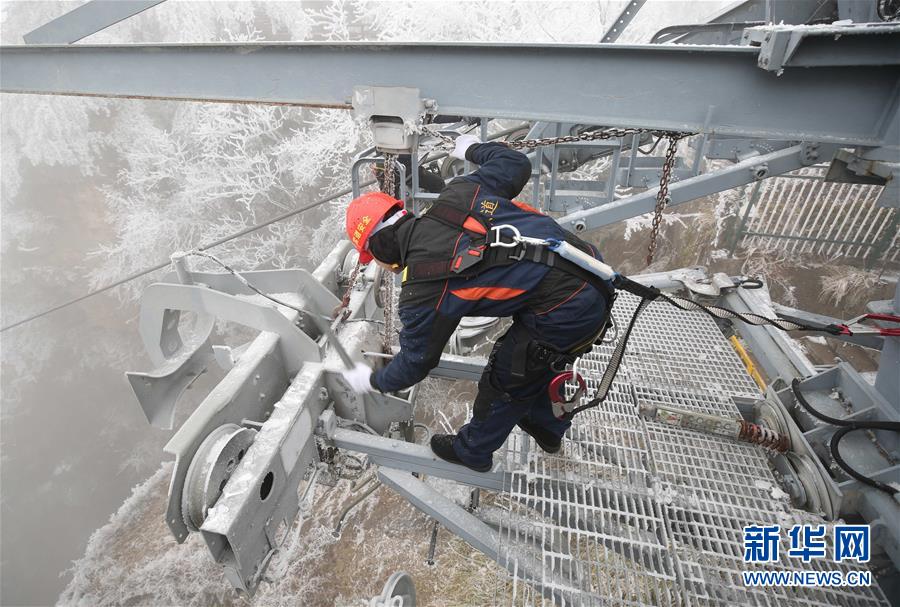 2月14日,张家界武陵源黄石寨索道工作人员在索道支架上清除冰雪。