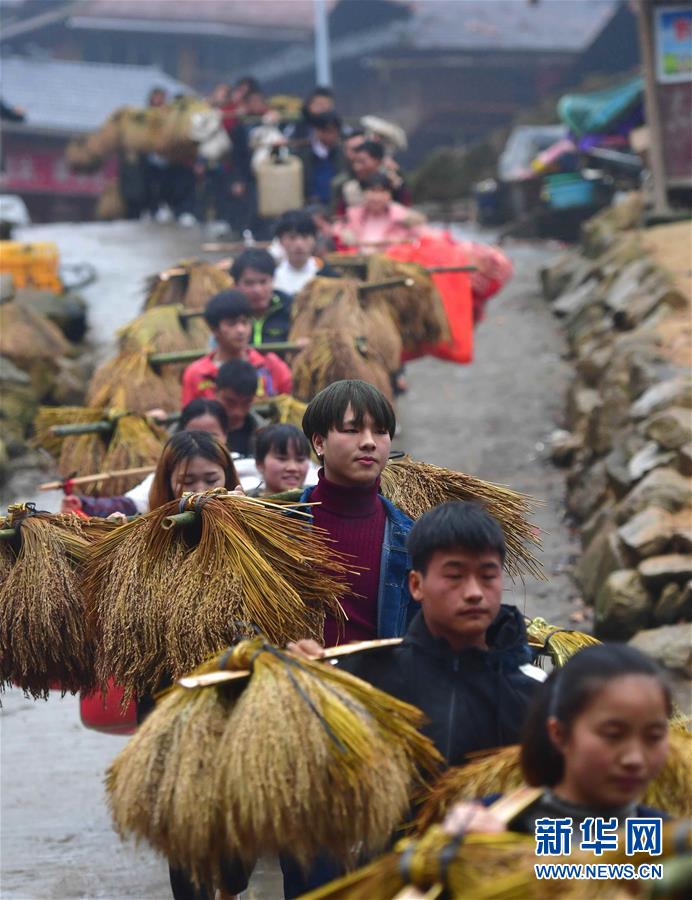 乌英苗寨的村民们挑着禾把去参加满月酒宴(1月19日摄)。新华社记者 黄孝邦 摄